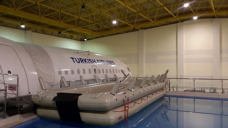 Отрабатывают будущие и нынешние сотрудники авиакомпании аварийные ситуации. Здесь есть даже бассейн. Девушки на занятиях прыгают в воду, «спасая» пассажиров, учатся спускать спасательные шлюпки и эвакуировать всех, кто находится на борту.