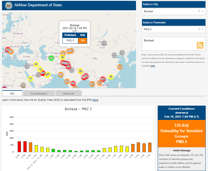 Посольство США в Кыргызстане также установило датчик. Информация обновляется каждый час. На 19.00 индекс качества воздуха в районе дипломатической миссии — 135 (AQI).
