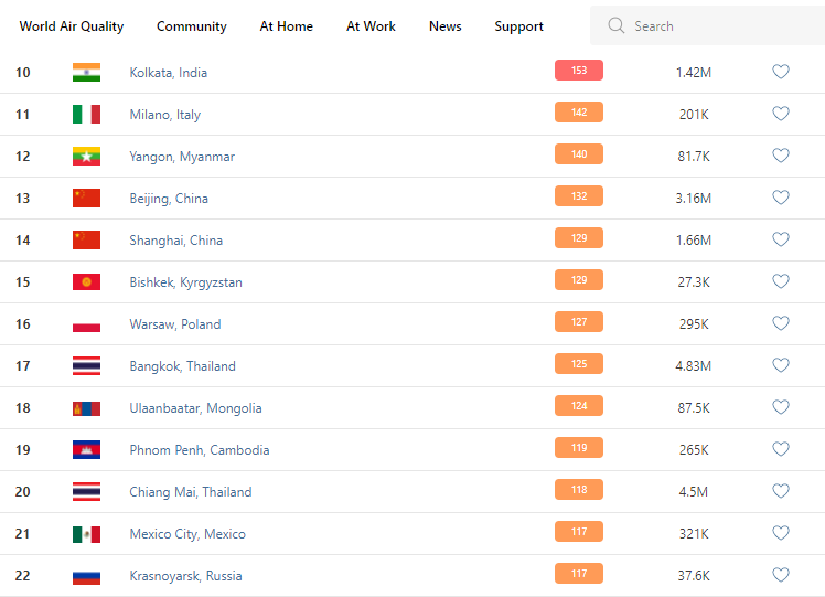 В рейтинге крупнейших городов мира по качеству воздуха World Air Quality Бишкек поднялся на 15-е место.