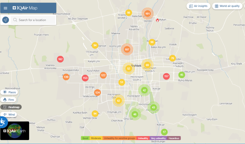 Общественный фонд «Институт экологических решений» установил датчики в столице и пригороде. На карте можно увидеть среднее значение AQI в разных районах Бишкека. Его обновляют ежечасно.