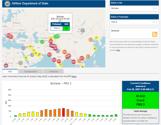 Посольство США в Кыргызстане также установило датчик. Информация обновляется каждый час. На 9.00 индекс качества воздуха в районе дипломатической миссии — 40 (AQI).