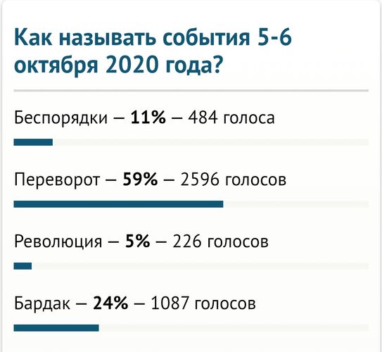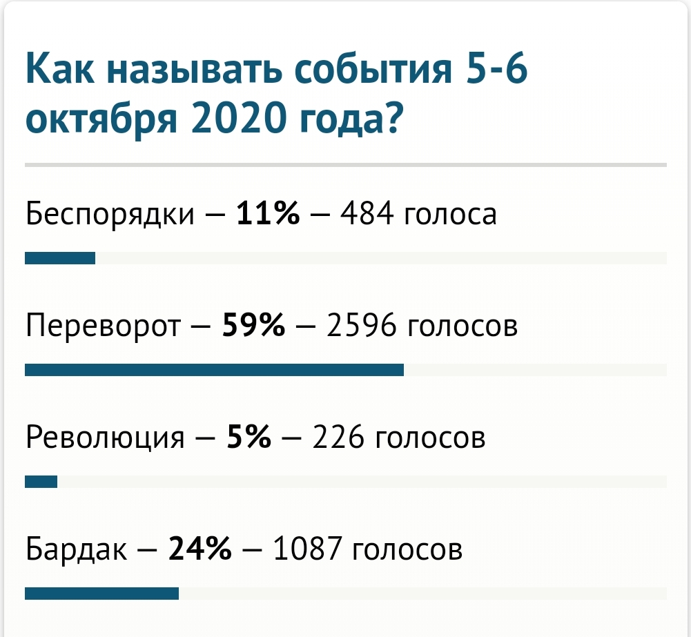 Как показали его итоги, из 4 тысяч 393 принявших участие большинство — 59 процентов (2 тысячи 596 человек) называют те события переворотом. 1 тысяча 87, или 24 процента, считают, что 5-6 октября в стране случился бардак. 484, или 11 процентов, полагают — это были беспорядки. И лишь 5 процентов респондентов (226 человек) оценили события 5-6 октября как революцию.