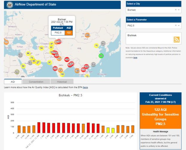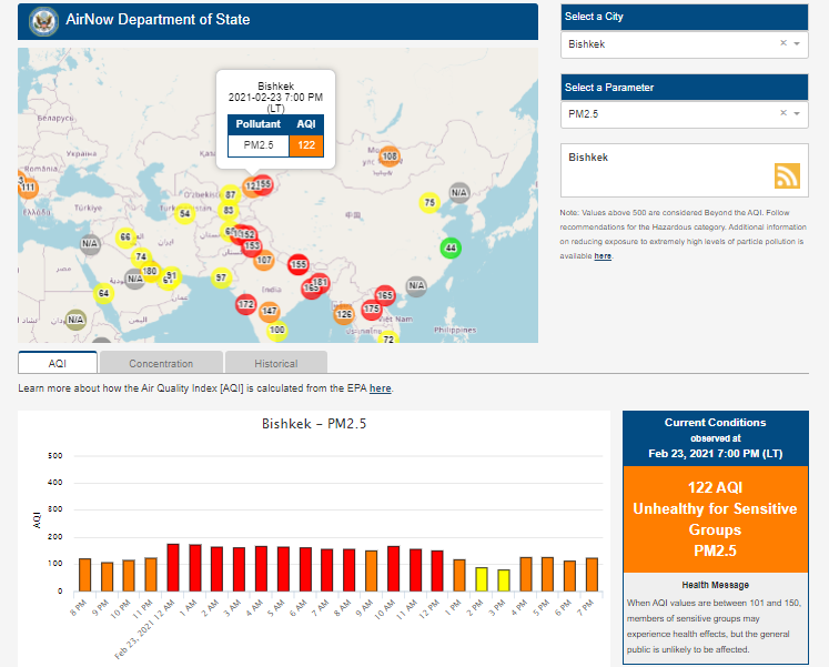 Посольство США в Кыргызстане также установило датчик. Информация обновляется каждый час. На 19.00 индекс качества воздуха в районе дипломатической миссии — 122 (AQI).