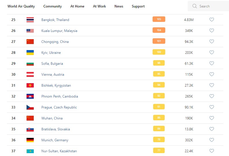 В рейтинге крупнейших городов мира по качеству воздуха World Air Quality Бишкек опустился на 31-е место.