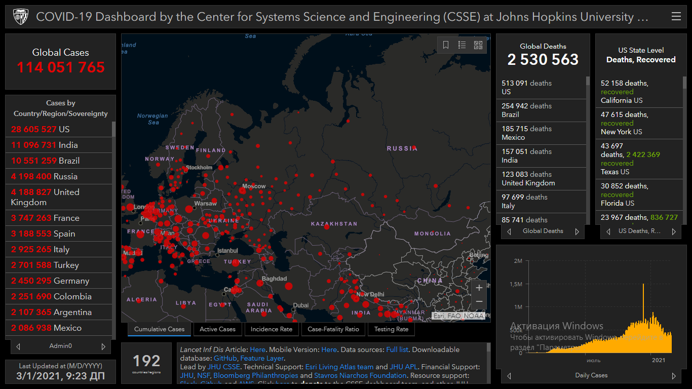 COVID-19 в мире. Заразились более 114 миллионов, умерли более 2,5 миллиона