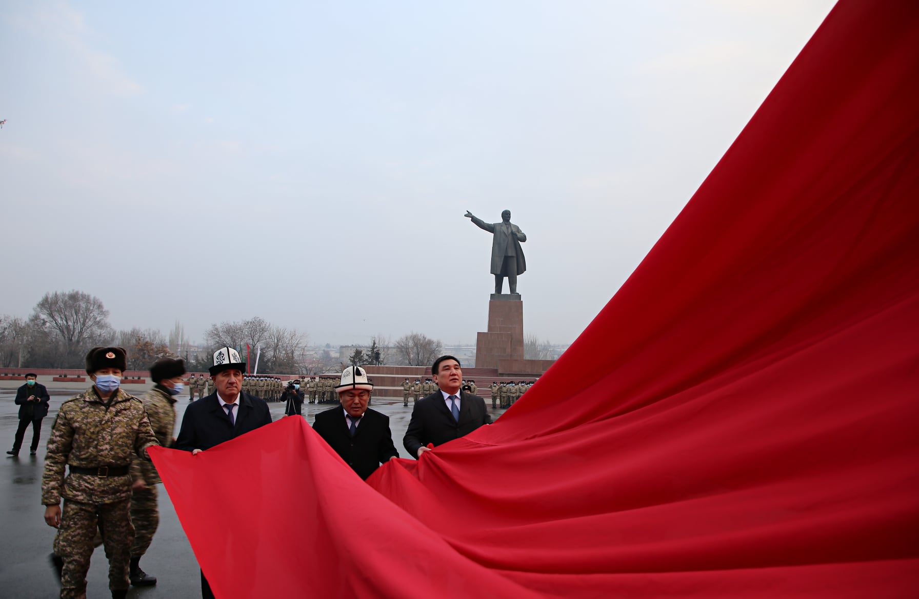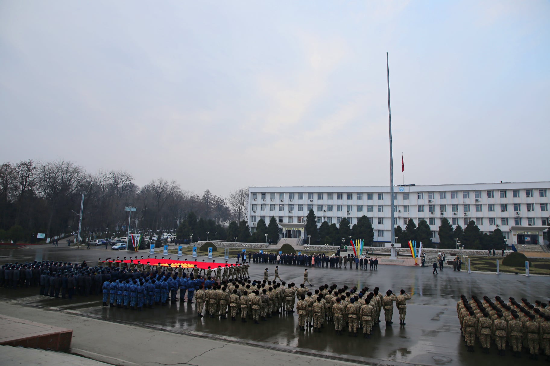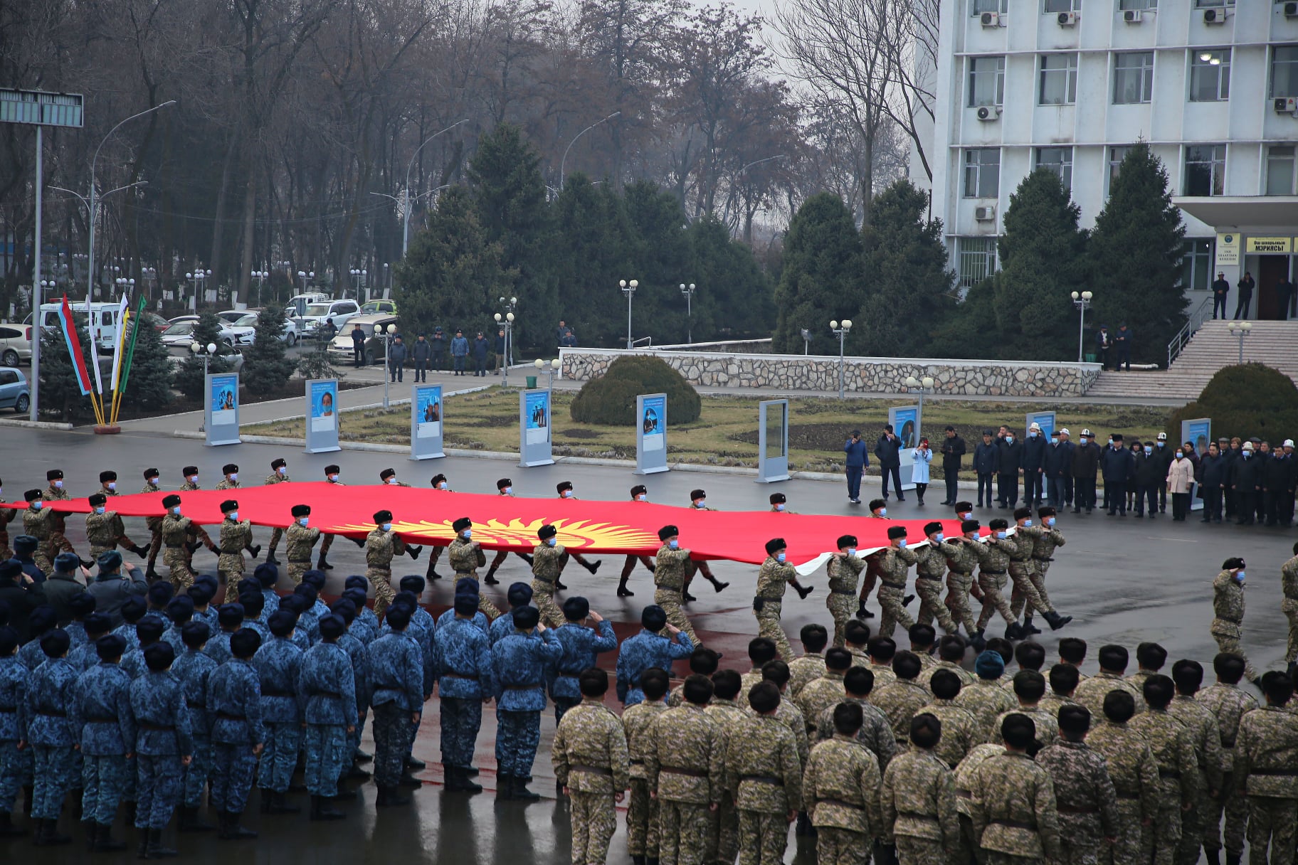 Военнослужащие Ошского гарнизона внесли на центральную площадь 15-метровый флаг, который под исполнение государственного гимна был поднят над площадью.