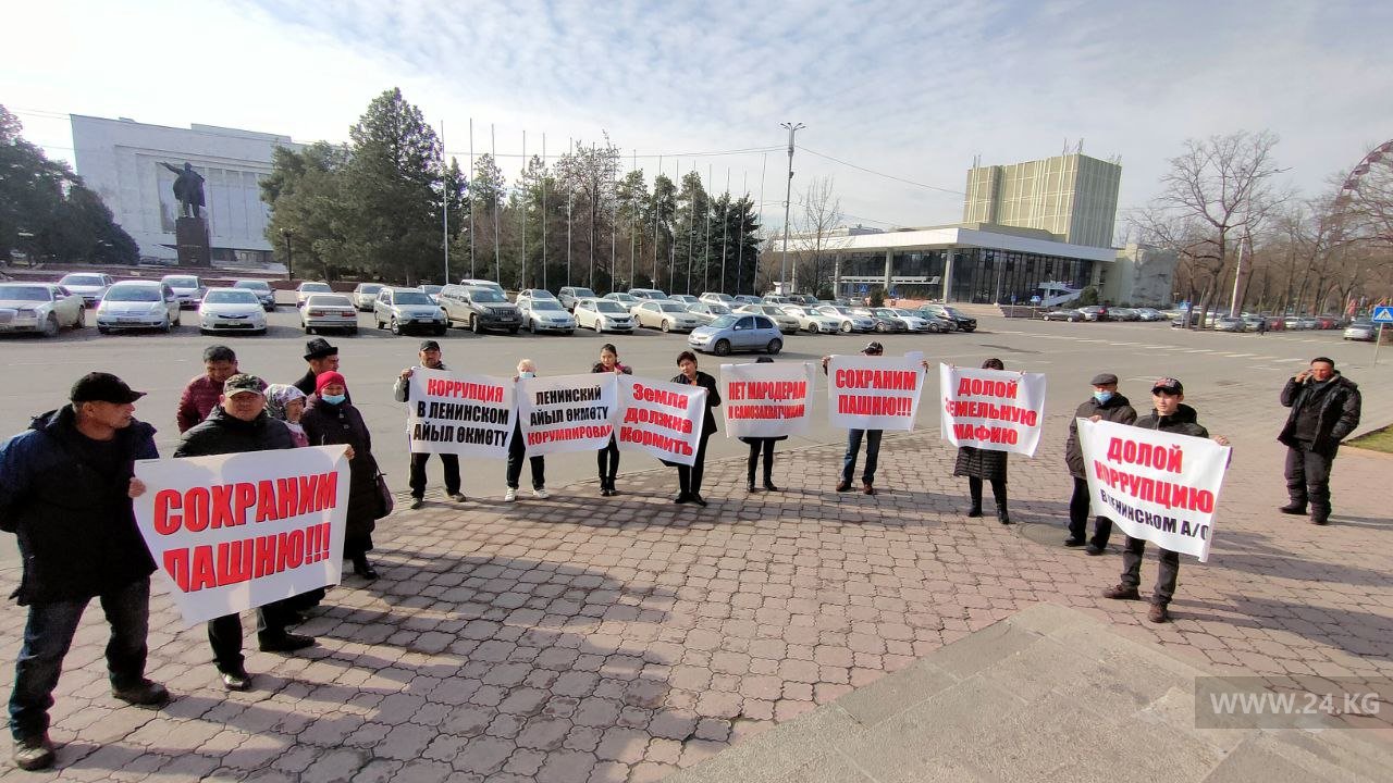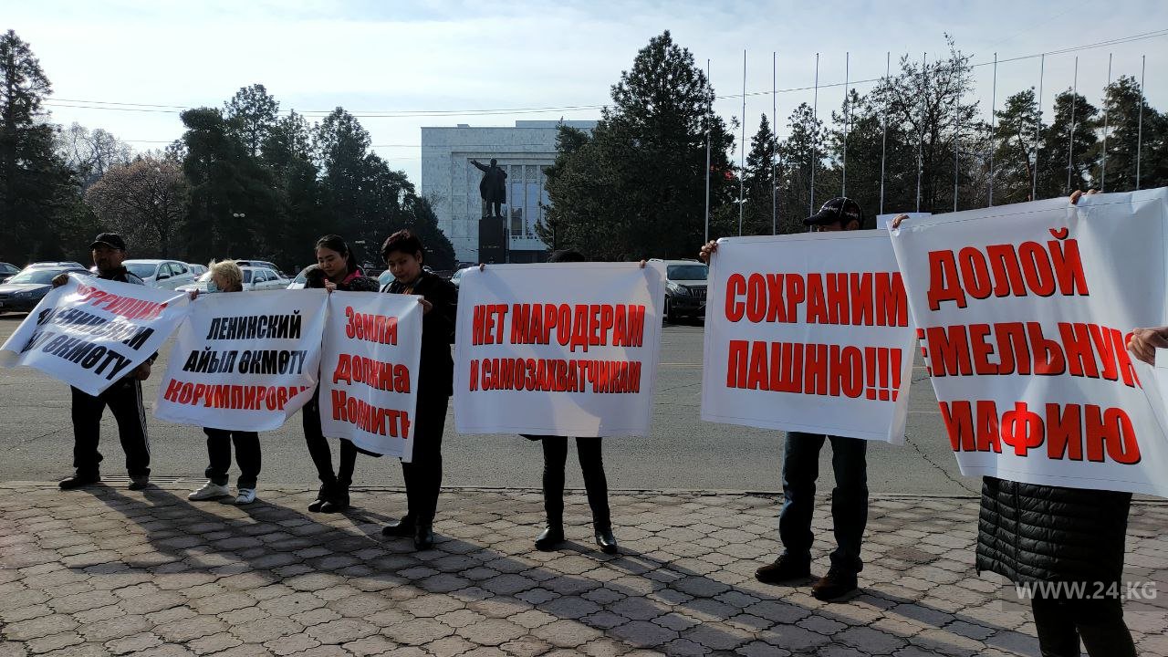 Жители Ленинского айыл окмоту вышли на митинг к Дому правительства. Около 15 человек обращаются к президенту Садыру Жапарову и просят его обратить внимание на захватчиков пахотных земель в их местности.