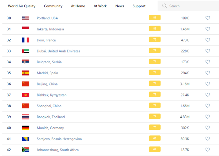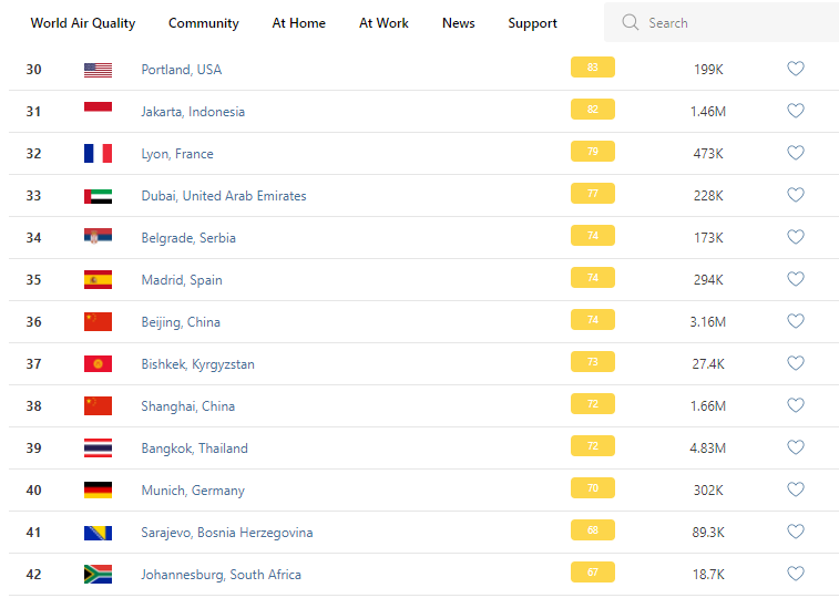 В рейтинге крупнейших городов мира по качеству воздуха World Air Quality Бишкек поднялся на 37-е место.