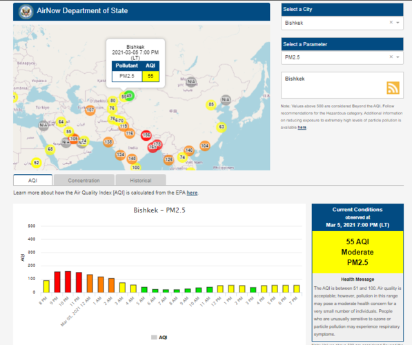Посольство США в Кыргызстане также установило датчик. Информация обновляется каждый час. На 19.00 индекс качества воздуха в районе дипломатической миссии — 55 (AQI).