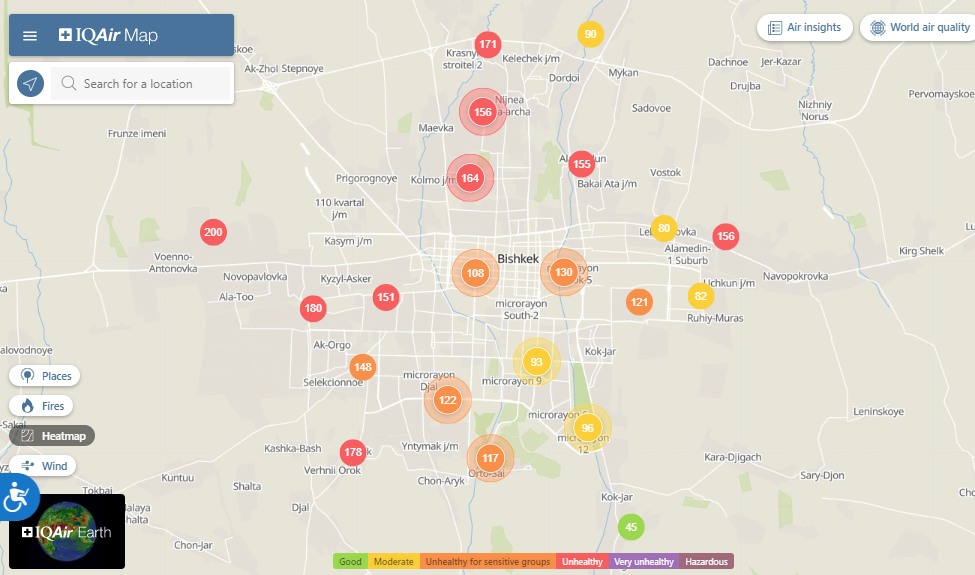 Общественный фонд «Институт экологических решений» установил датчики в столице и пригороде. На карте можно увидеть среднее значение AQI в разных районах Бишкека. Его обновляют ежечасно.
