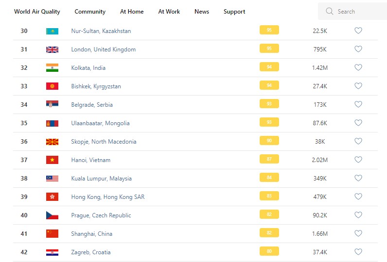 В рейтинге крупнейших городов мира по качеству воздуха World Air Quality Бишкек опустился на 33-е место.