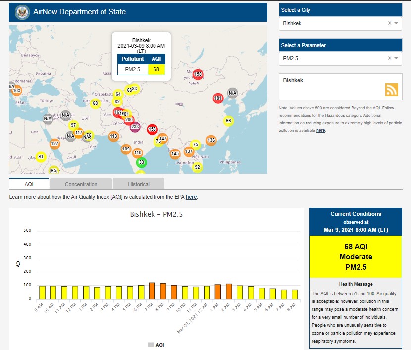 Посольство США в Кыргызстане также установило датчик. Информация обновляется каждый час. На 8.00 индекс качества воздуха в районе дипломатической миссии — 68 (AQI).
