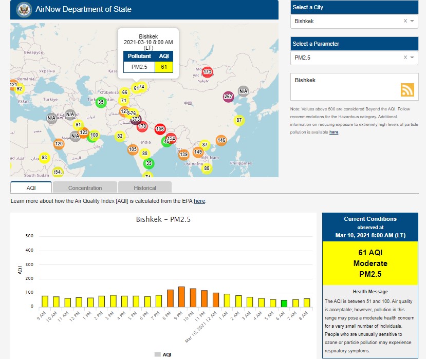 Посольство США в Кыргызстане также установило датчик. Информация обновляется каждый час. На 8.00 индекс качества воздуха в районе дипломатической миссии — 61 (AQI).