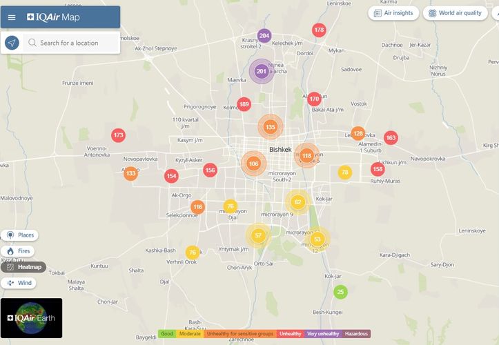 Общественный фонд «Институт экологических решений» установил датчики в столице и пригороде. На карте можно увидеть среднее значение AQI в разных районах Бишкека. Его обновляют ежечасно.