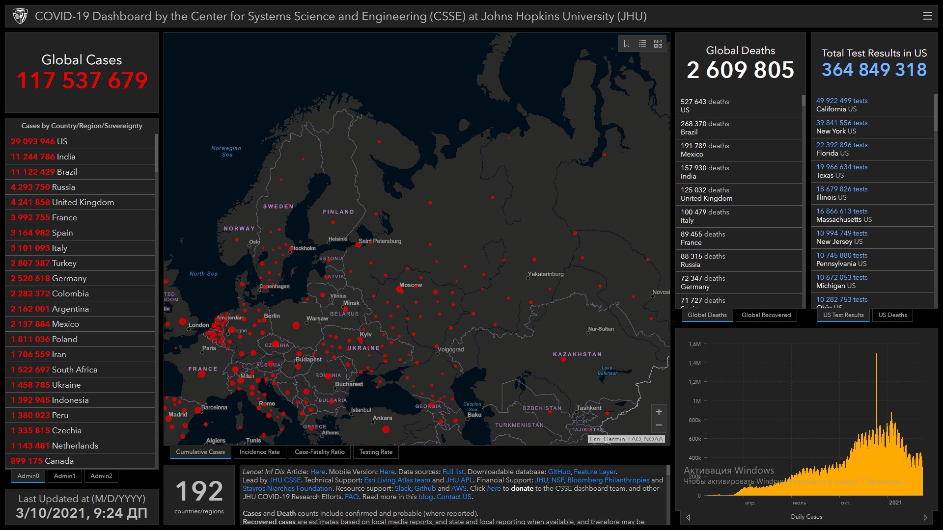 Всего в мире коронавирусом заразились 117 миллионов 537 тысяч 679 человек. Больше всего зараженных в США (29 миллионов 93 тысячи 946), Индии (11 миллионов 244 тысячи 786), Бразилии (11 миллионов 122 тысячи 429), России (4 миллиона 293 тысячи 750), Великобритании (4 миллиона 241 тысяча 858), Франции (3 миллиона 992 тысячи 755), Испании (3 миллиона 164 тысячи 982), Италии (3 миллиона 101 тысяча 93), Турции (2 миллиона 807 тысяч 387), Германии (2 миллиона 520 тысяч 618) и Колумбии (2 миллиона 282 тысячи 382).
