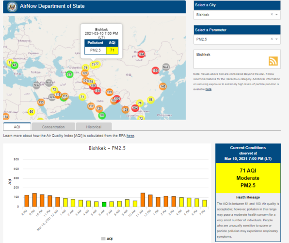 Посольство США в Кыргызстане также установило датчик. Информация обновляется каждый час. На 19.00 индекс качества воздуха в районе дипломатической миссии — 71 (AQI).