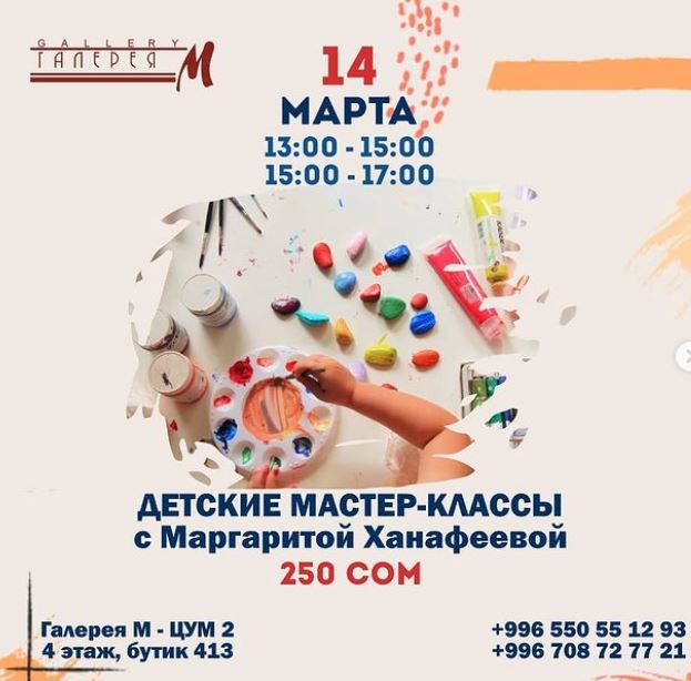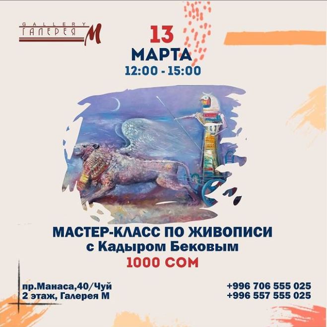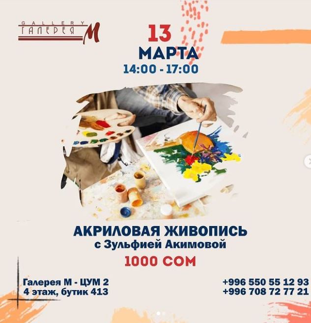 Зульфия Акимова проведет мастер-класс по акриловой живописи в «Галерее М» в ЦУМ-2, Кадыр Беков — в филиале на проспекте Манаса.