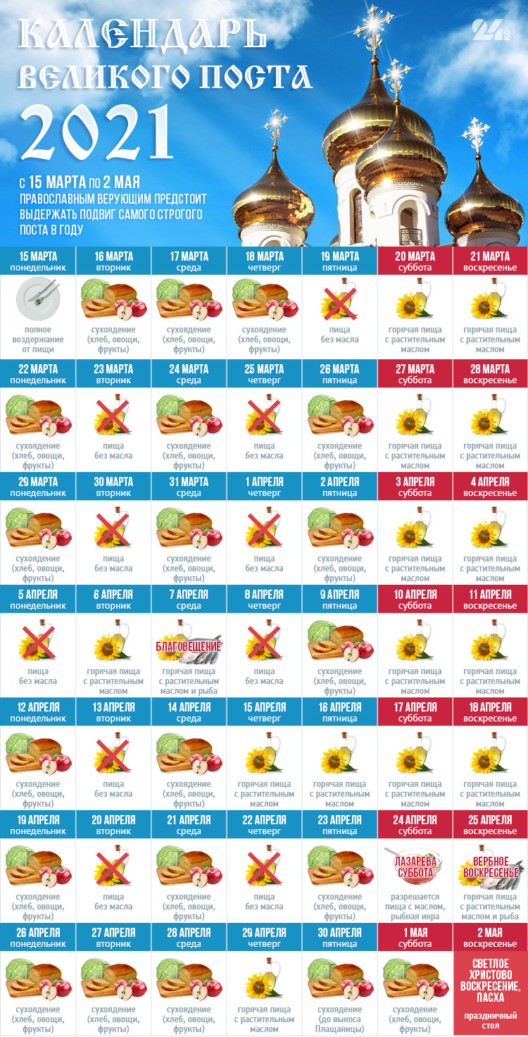 По выходным можно есть горячую пищу с добавлением растительного масла. Есть в пост и дни, когда ограничения на масло и продукты животного происхождения не действуют. Речь идет о больших православных праздниках — Благовещении, Лазаревой субботе и Вербном воскресенье.