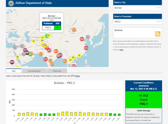 Посольство США в Кыргызстане также установило датчик. Информация обновляется каждый час. На 9.00 индекс качества воздуха в районе дипломатической миссии — 41 (AQI).