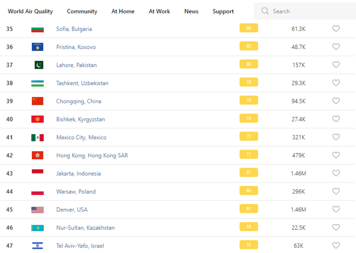 В рейтинге крупнейших городов мира по качеству воздуха World Air Quality Бишкек находится на 40-м месте.
