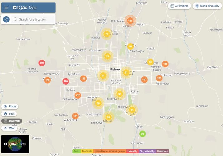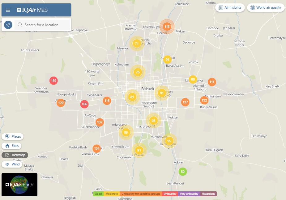 Общественный фонд «Институт экологических решений» установил датчики в столице и пригороде. На карте можно увидеть среднее значение AQI в разных районах Бишкека. Его обновляют ежечасно.