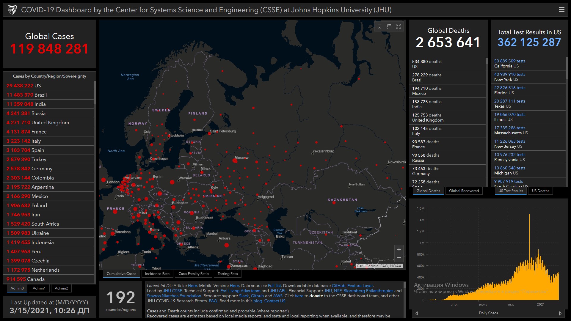 COVID-19 в мире. Заразились более 119,8 миллиона, умерли более 2,6 миллиона