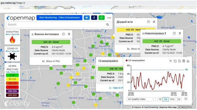 В Бишкеке и пригороде заработала первая электронная экологическая карта качества воздуха. О состоянии атмосферы в режиме реального времени можно ознакомиться на сайте Кыргызгидромета при МЧС и программы Экономического коридора Алматы — Бишкек.