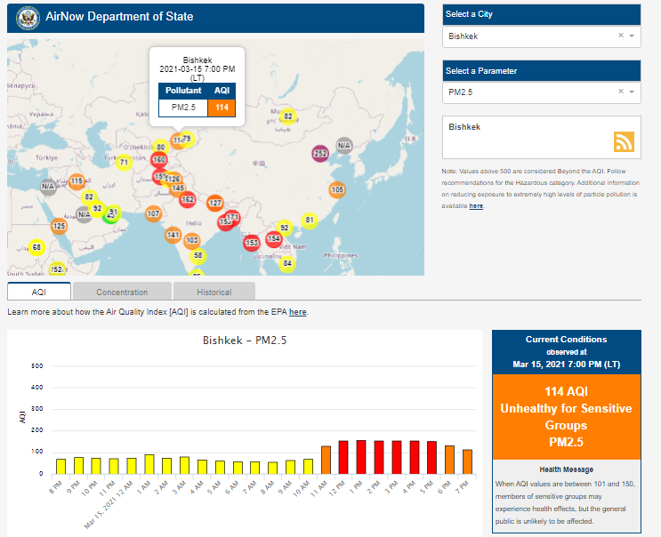 Посольство США в Кыргызстане также установило датчик. Информация обновляется каждый час. На 19.00 индекс качества воздуха в районе дипломатической миссии — 114 (AQI).