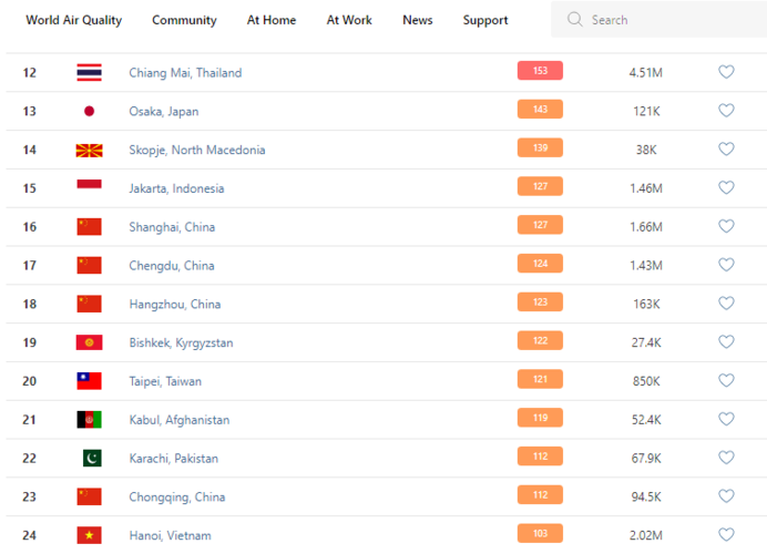 В рейтинге крупнейших городов мира по качеству воздуха World Air Quality Бишкек поднялся на 19-е место.
