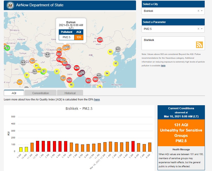 Посольство США в Кыргызстане также установило датчик. Информация обновляется каждый час. На 8.00 индекс качества воздуха в районе дипломатической миссии — 131 (AQI).