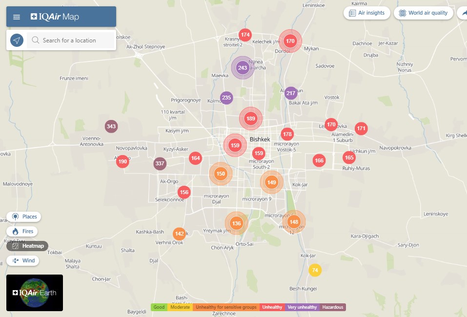 Общественный фонд «Институт экологических решений» установил датчики в столице и пригороде. На карте можно увидеть среднее значение AQI в разных районах Бишкека. Его обновляют ежечасно.