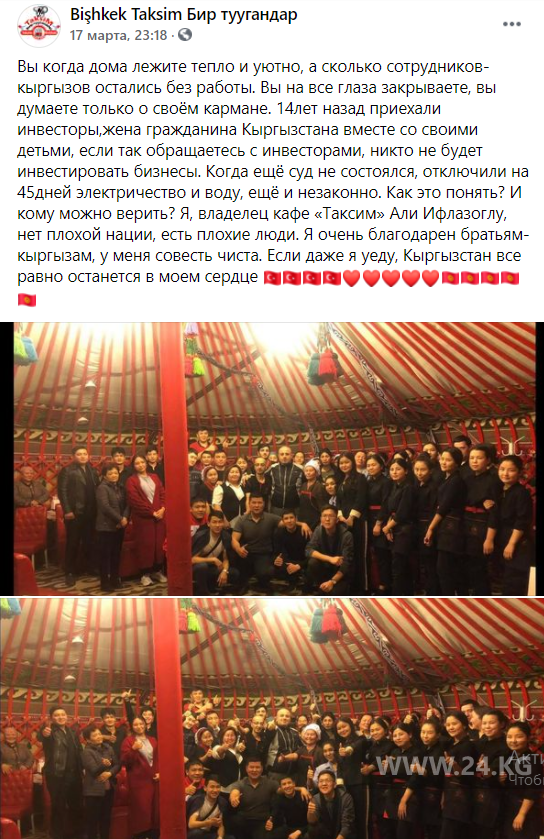 «Возможно, это последнее видео, которое я снимаю в Кыргызстане. Обращаюсь к президенту Турции Реджепу Тайипу Эрдогану. В 2007 году на собрании вы сказали, чтобы мы инвестировали в земли наших предков. Я приехал в Кыргызстан и вложился, открыл семейное кафе. Трудоустроил местных. Выплачиваю налоги. Вложил $470 тысяч. За разрешение заплатил $70 тысяч. Взамен что я получаю? Пятьдесят человек остались без работы. Кафе теперь уходит под снос, на его месте хотят построить торговый центр. В Кыргызстане законы не работают», — заявил Али Ифлазоглу в своем видеообращении.