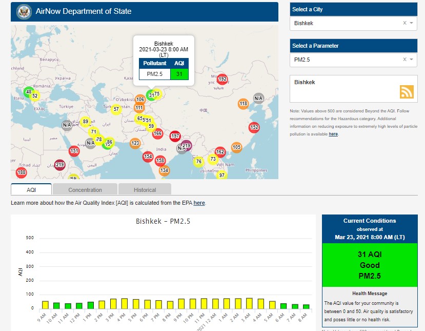Посольство США в Кыргызстане также установило датчик. Информация обновляется каждый час. На 8.00 индекс качества воздуха в районе дипломатической миссии — 31 (AQI).