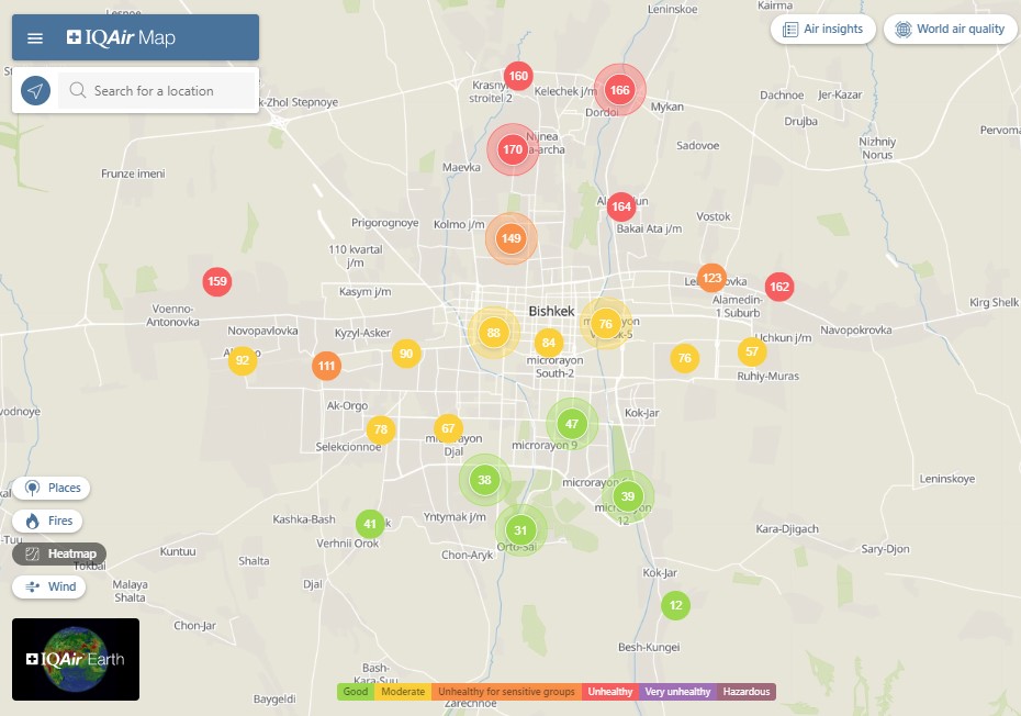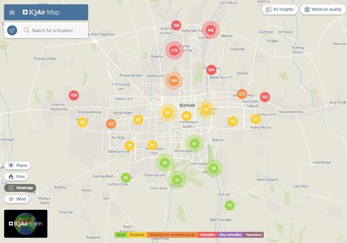 Общественный фонд «Институт экологических решений» установил датчики в столице и пригороде. На карте можно увидеть среднее значение AQI в разных районах Бишкека. Его обновляют ежечасно.