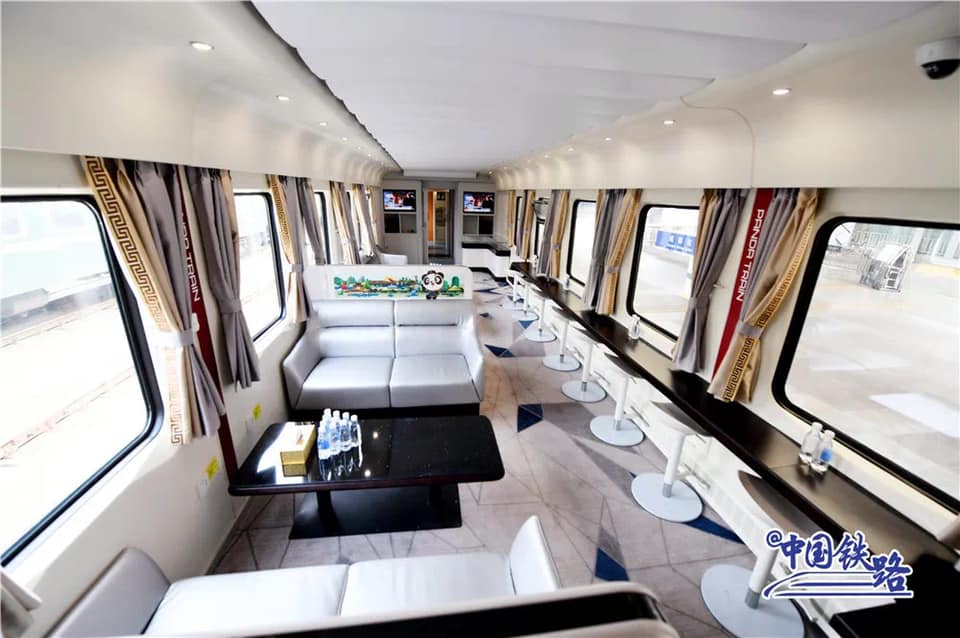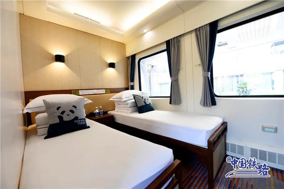 Поезд с изображением панды выглядит как отель на колесах. В нем есть спальные вагоны с душевыми кабинами, вагон с сидячими местами, ресторан и несколько игровых зон и зон отдыха.