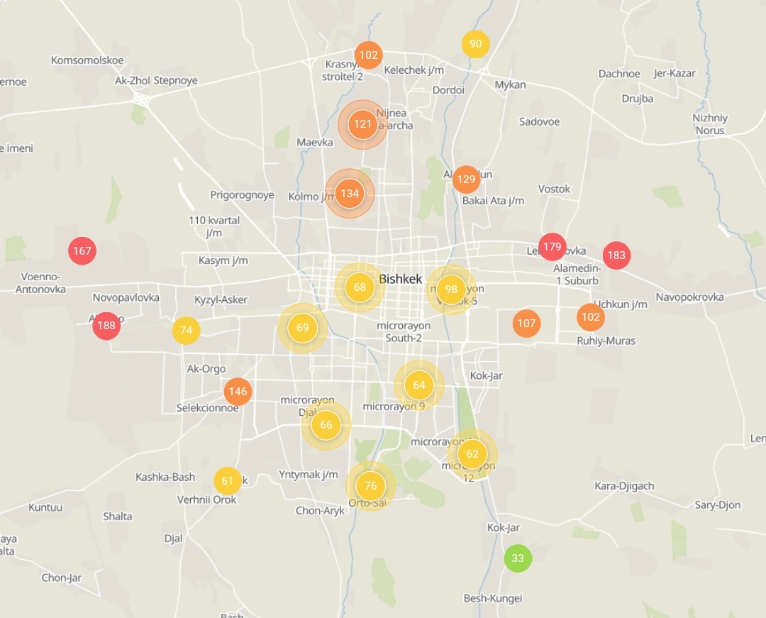Общественный фонд «Институт экологических решений» установил датчики в столице и пригороде. На карте можно увидеть среднее значение AQI в разных районах Бишкека. Его обновляют ежечасно.
