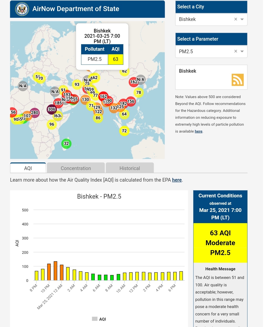 Посольство США в Кыргызстане также установило датчик. Информация обновляется каждый час. На 19.00 индекс качества воздуха в районе дипломатической миссии — 63 (AQI).
