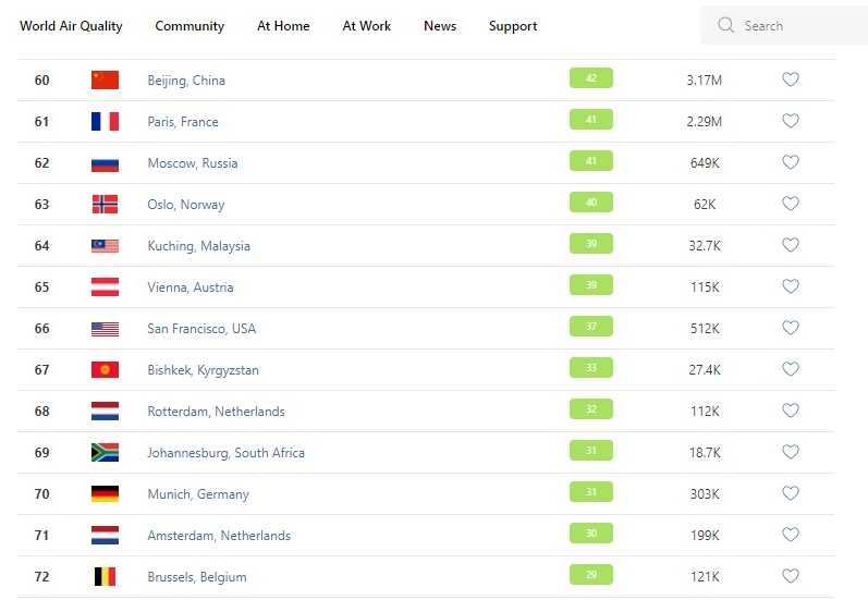 В рейтинге крупнейших городов мира по качеству воздуха World Air Quality Бишкек опустился на 67-е место.