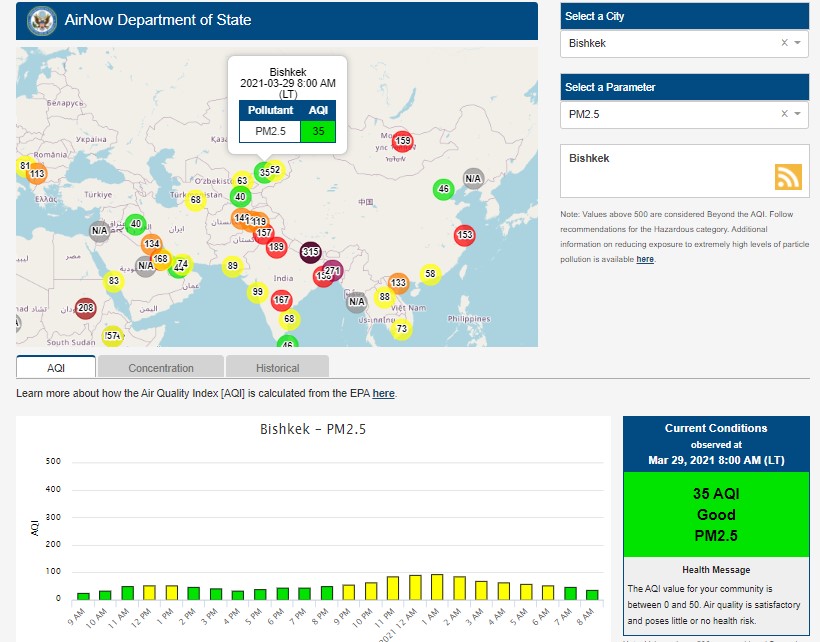 Посольство США в Кыргызстане также установило датчик. Информация обновляется каждый час. На 8.00 индекс качества воздуха в районе дипломатической миссии — 35 (AQI).