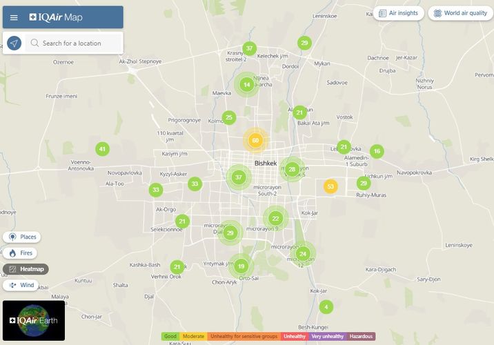 Общественный фонд «Институт экологических решений» установил датчики в столице и пригороде. На карте можно увидеть среднее значение AQI в разных районах Бишкека. Его обновляют ежечасно.