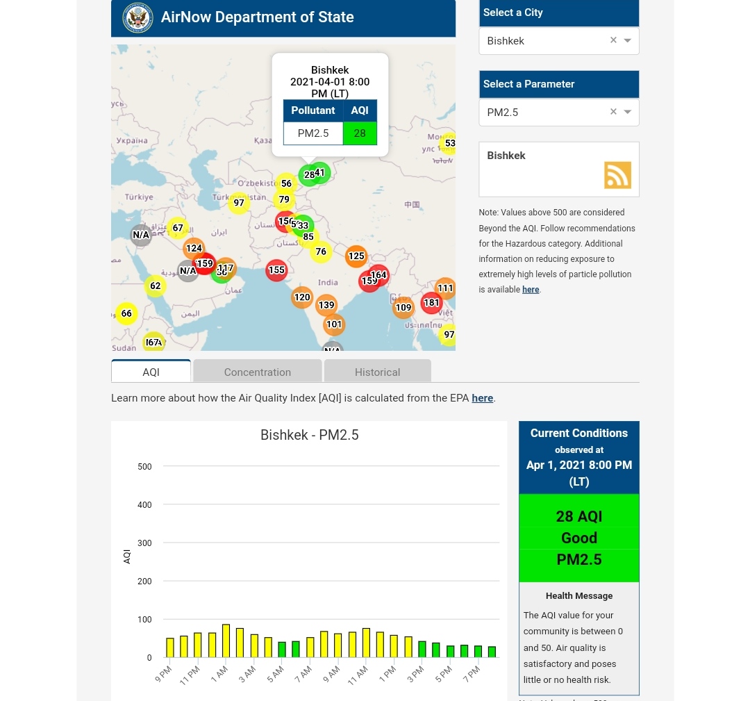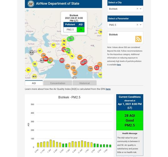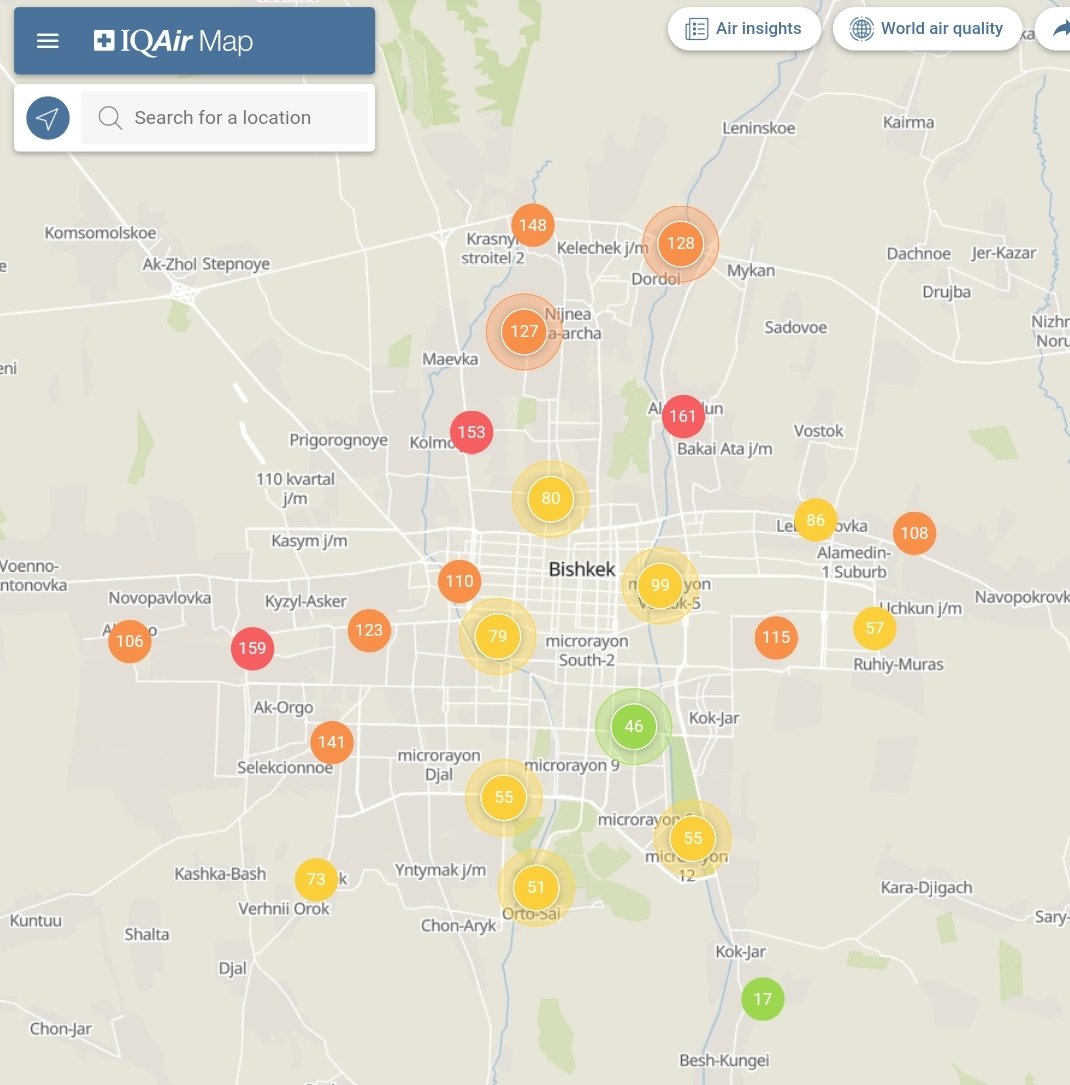 Общественный фонд «Институт экологических решений» установил датчики в столице и пригороде. На карте можно увидеть среднее значение AQI в разных районах Бишкека. Его обновляют ежечасно.Посольство США в Кыргызстане также установило датчик. Информация обновляется каждый час. На 19.00 индекс качества воздуха в районе дипломатической миссии — 28 (AQI).