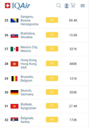 В рейтинге крупнейших городов мира по качеству воздуха World Air Quality Бишкек опустился на 31-е место.