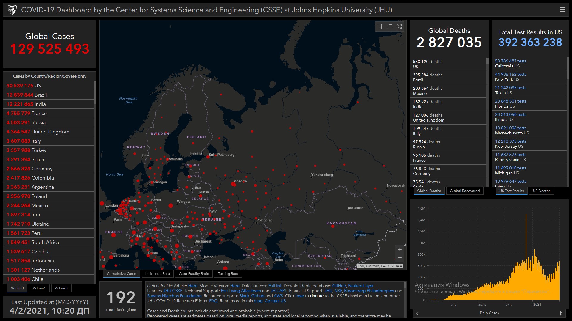 Всего в мире коронавирусом заразились 129 миллионов 525 тысяч 493 человека. Больше всего зараженных в США (30 миллионов 539 тысяч 175), Бразилии (12 миллионов 839 тысяч 844), Индии (12 миллионов 221 тысяча 665), Франции (4 миллиона 755 тысяч 779), России (4 миллиона 503 тысячи 291), Великобритании (4 миллиона 364 тысячи 547), Италии (3 миллиона 607 тысяч 83), Турции (3 миллиона 357 тысяч 988), Испании (3 миллиона 291 тысяча 394), Германии (2 миллиона 866 тысяч 323) и Колумбии (2 миллиона 417 тысяч 826).