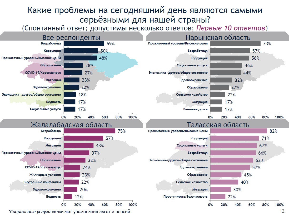 По его данным, 59 процентов респондентов ответили, что основная проблема в стране это безработица. 50 процентов кыргызстанцев считают, что коррупция негативно сказывается на развитии государства. Еще 48 процентов участников социологического исследования отметили низкий уровень прожиточного минимума и высокие цены на продукты. 28 процентов опрошенных говорят о том, что пандемия COVID-19 — актуальная проблема в Кыргызстане. Только один процент участвующих в опросе не видит недочетов и проблем в государстве.