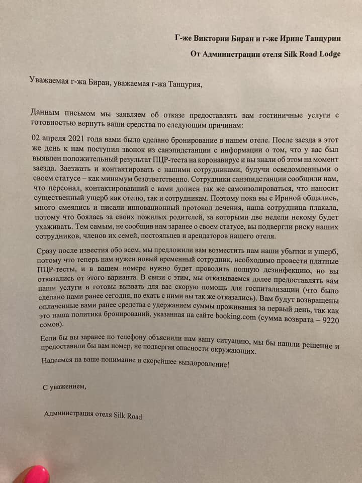 «Заезжать и контактировать с нашими сотрудниками, будучи осведомленными о своем статусе, как минимум безответственно. Сотрудники санэпидстанции сообщили нам, что персонал, контактировавший с вами, должен также самоизолироваться, что наносит существенный ущерб как отелю, так и сотрудникам», — говорится в письме администрации, оставленном у двери номера, куда поселились туристки.