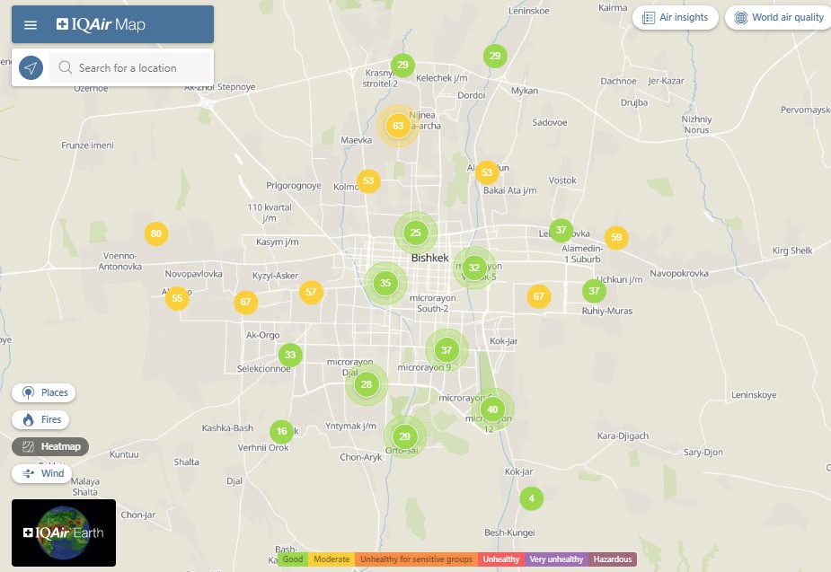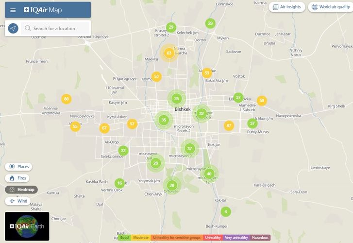 Общественный фонд «Институт экологических решений» установил датчики в столице и пригороде. На карте можно увидеть среднее значение AQI в разных районах Бишкека. Его обновляют ежечасно.