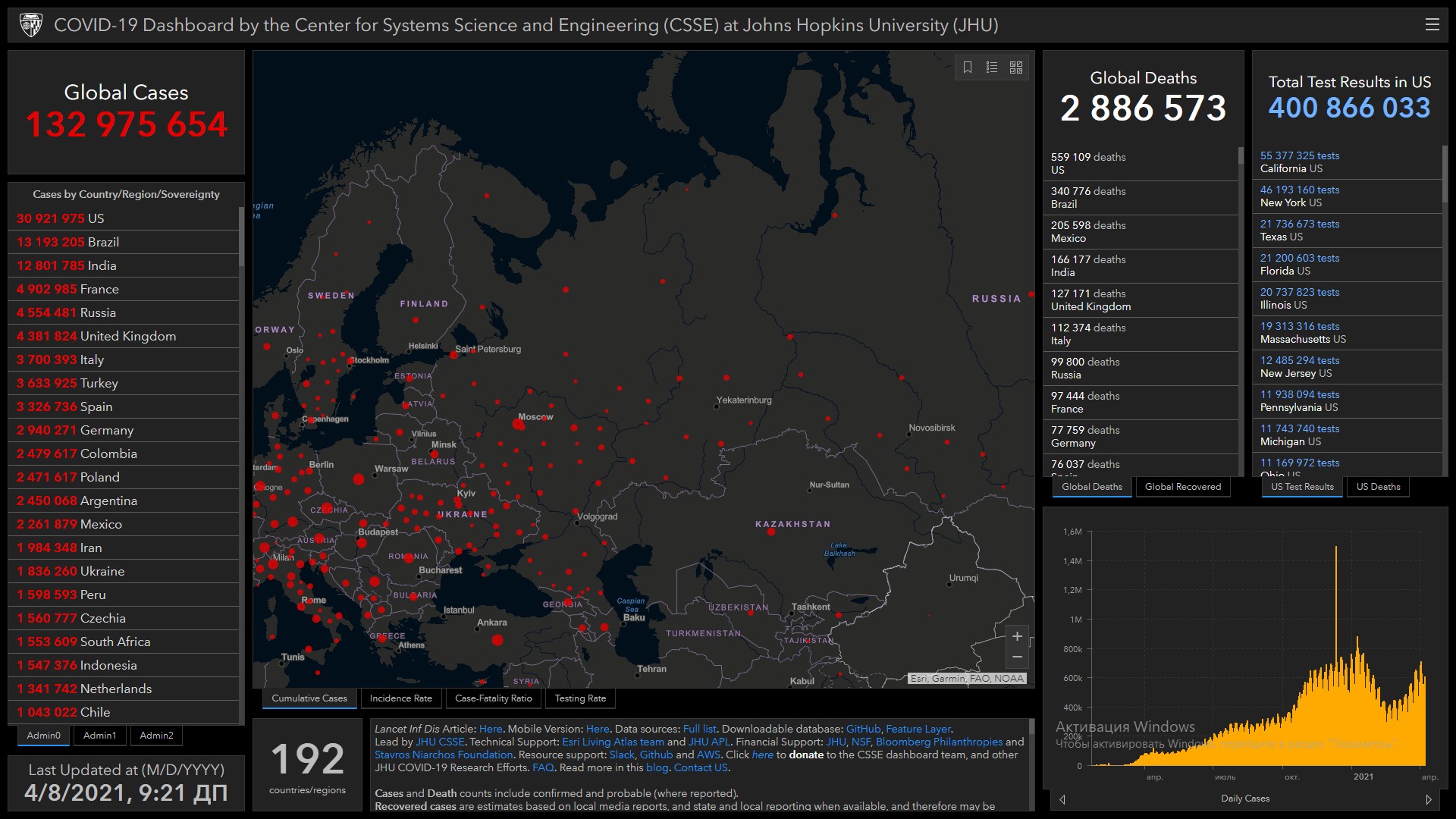 Всего в мире коронавирусом заразились 132 миллиона 975 тысяч 654 человека. Больше всего зараженных в США (30 миллионов 921 тысяча 975), Бразилии (13 миллионов 193 тысячи 205), Индии (12 миллионов 801 тысяча 785), Франции (4 миллиона 902 тысячи 985), России (4 миллиона 554 тысячи 481), Великобритании (4 миллиона 381 тысяча 824), Италии (3 миллиона 700 тысяч 393), Турции (3 миллиона 633 тысячи 925), Испании (3 миллиона 326 тысяч 736), Германии (2 миллиона 940 тысяч 271) и Колумбии (2 миллиона 479 тысяч 617).