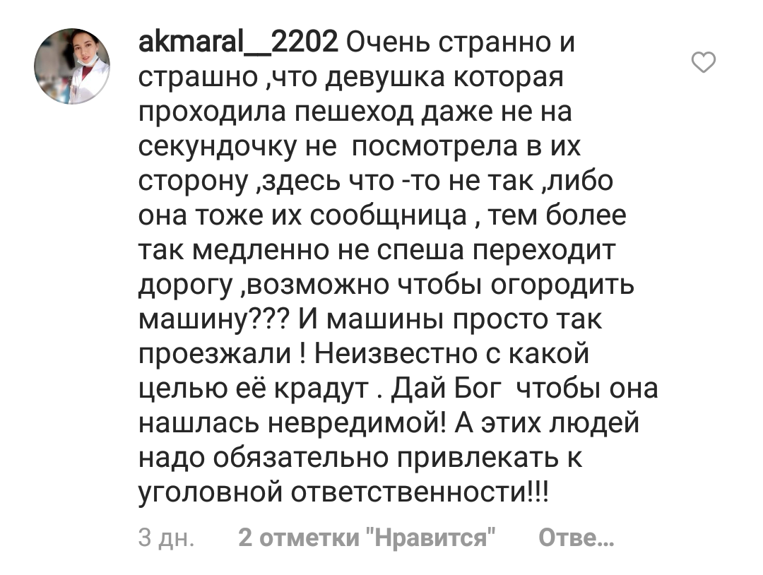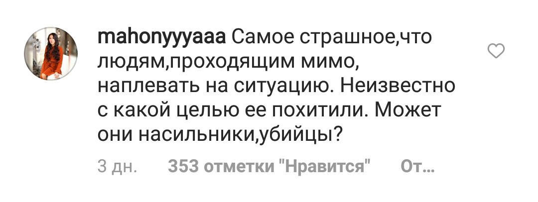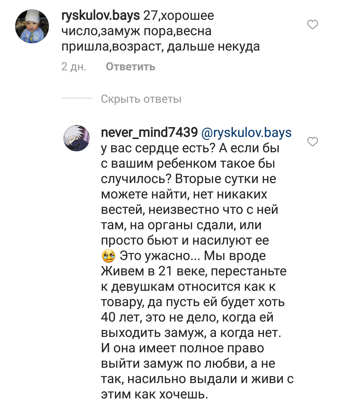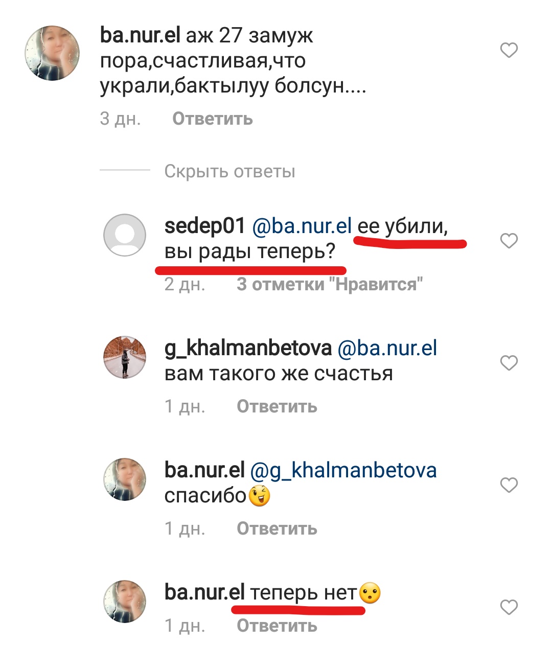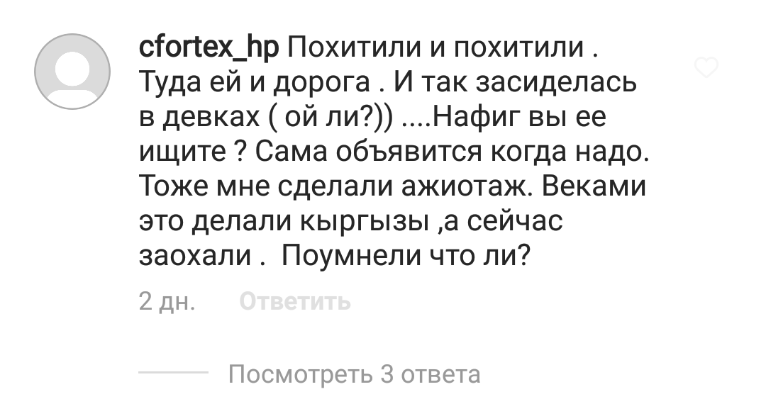 В комментариях под видео похищения девушки три дня назад аккаунт km_alexs подшутил, что скоро состоится свадьба. Однако после опубликованной новости о том, что девушку убили, он у себя на странице поделился высказыванием, что «жениться нужно только по настоящей любви...»