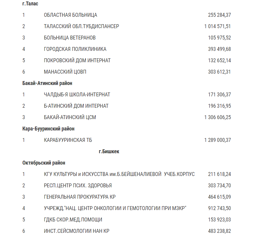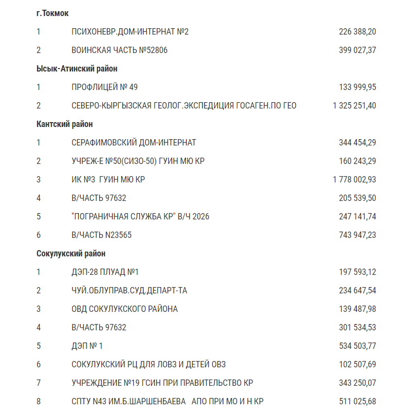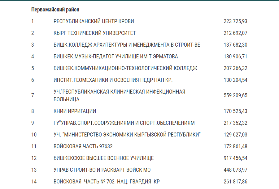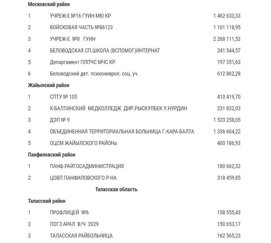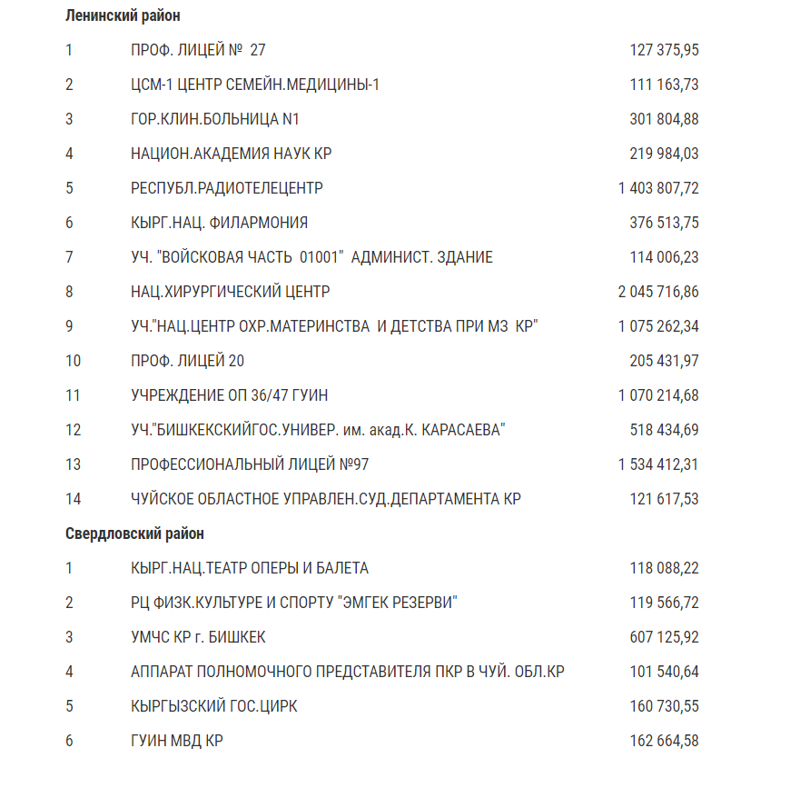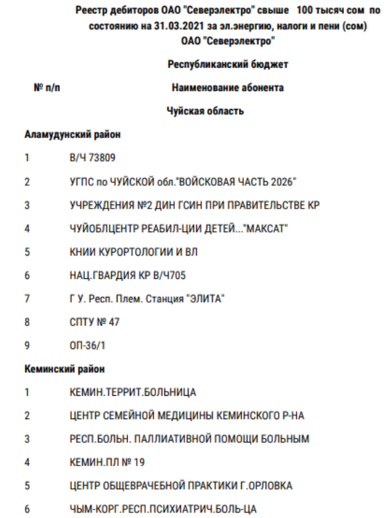 В компании предоставили список государственных учреждений Бишкека, Чуйской и Таласской областей, которые накопили большие долги перед ОАО «Северэлектро».