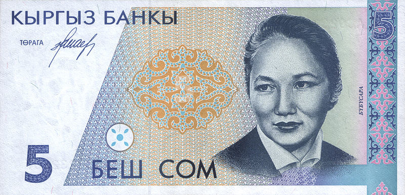 Лицевая сторона купюры номиналом 5 сомов содержала портрет знаменитой кыргызской балерины Бюбюсары Бейшеналиевой. На оборотной стороне было помещено изображение Кыргызского государственного академического театра оперы и балета имени Абдыласа Малдыбаева. Доминирующий цвет купюры — синий.